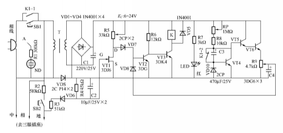當(dāng)使用dc電源插座的電器有漏電現(xiàn)象時(shí),由R3、R4、VD5、VD6等組成的漏電檢測(cè)電路、提供VT1的夾斷電壓,可以使UD電位上升,VT2飽和導(dǎo)通,VT2很快截止,繼電器釋放而斷電,達(dá)到漏電保護(hù)的目的。紅色發(fā)光管LED作供電指示。